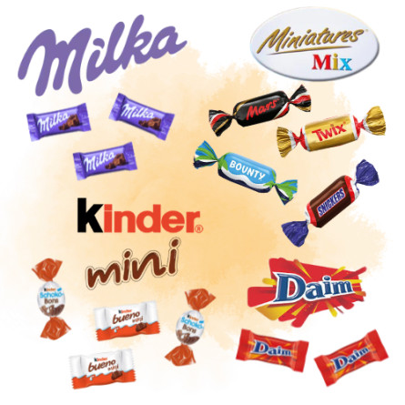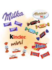 Miniatures mix : sucre, sirop de glucose, beurre de cacao, lait écrémé en poudre, pâte de cacao, cacahuètes, matière grasse végétale, beurre concentré, lactose, farine de blé, noix de coco séchée, petit lait en poudre, huile de tournesol, lait entier en poudre, émulsifiants (lécithine de SOJA, E471), extrait de malt d'orge, cacao maigre, sel, humectant (glycérol), blanc d'œuf en poudre, extrait naturel de vanille, protéine de lait hydrolysée, poudres à lever (E341, E500, E501)