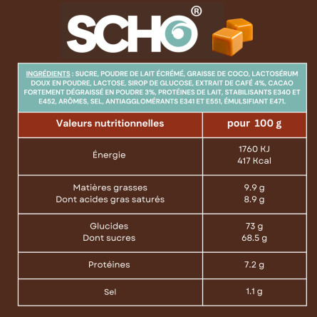 Ingrédients : sucre, lait écrémé en poudre, sirop de glucose, lactosérum doux en poudre, graisse de coco, lactose, extrait de café (4%), cacao fortement dégraissé en poudre (3%), arôme, sel, stabilisants (E 340, E 452), anti-agglomérants (E 341 iii, E 551), protéines de lait, émulsifiant (E 472e).