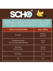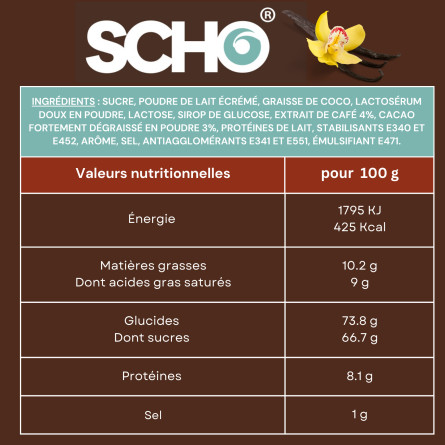 Ingrédients : sucre, lait écrémé en poudre, sirop de glucose, lactosérum doux en poudre, graisse de coco, lactose, extrait de café (4%), cacao fortement dégraissé en poudre (3%), arôme, sel, stabilisants (E 340, E 452), épaississant (E 415), Antiagglo-mérants (E 341iii, E 551), proteines de lait, émulsifiant (E 472e).