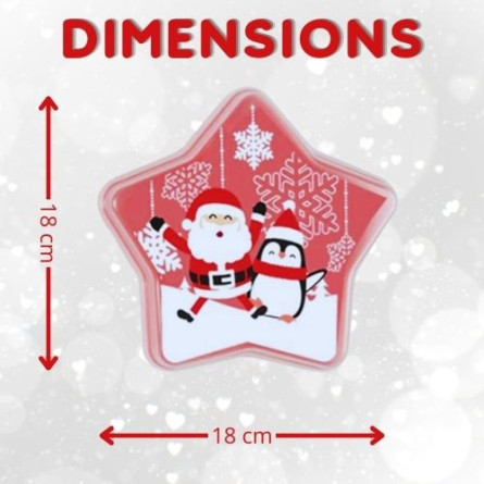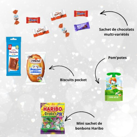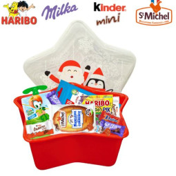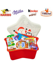 Cette jolie boite en plastique et en forme d'étoile est parfaite pour les goûters de Noël ! Elle est garnie de 20 gourmandises : Schokobons, Mini Bueno, Daim, Compote gourde, LU petit écolier 38g, Madeleines, Sachet Haribo 30g