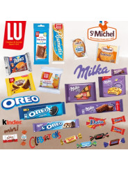 Valisette garnie de : 1 Milka Cookies, 1 Milka Brownies, 1 Milka Lu Pocket, 1 Milka barre oréo, 1 barre Oréo, 1 Barre Nuts Grany, 1 biscuit choco Grany, 1 LU Plumétis Vanille, 1 LU veritable petit beurre, 1 LU Prince, 1 LU Petit écolier, 2 madeleines, 2 galettes, 15 chocolats Mini Mars, Mini Twix, Mini Snickers.. 5 Kinder Bueno et Schokobons, 5 Daim, 5 Milka Naps.