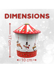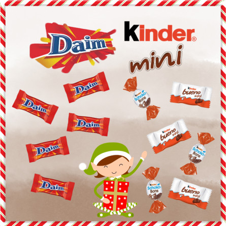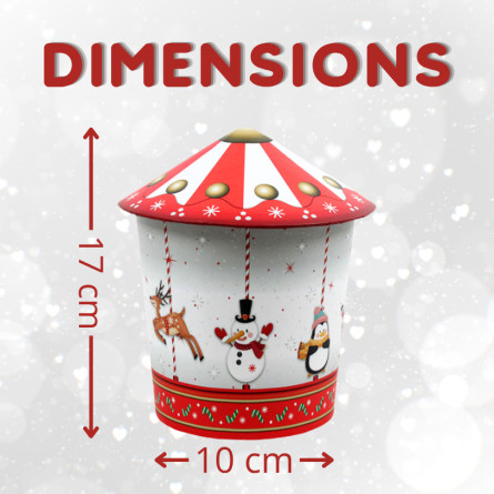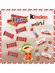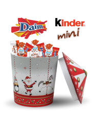 Cette boite en carton au design de manège de Noël avec Père Noël et pingouin, est garnie de 45 chocolats Kinder Schokobons, Mini Bueno, Daim.