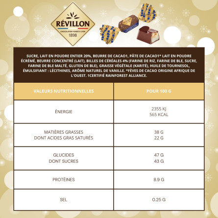5 variétés : céréales croustillantes chocolat au lait, double praliné noisette chocolat au lait, pâtes de fruits abricot, fraise et poire.