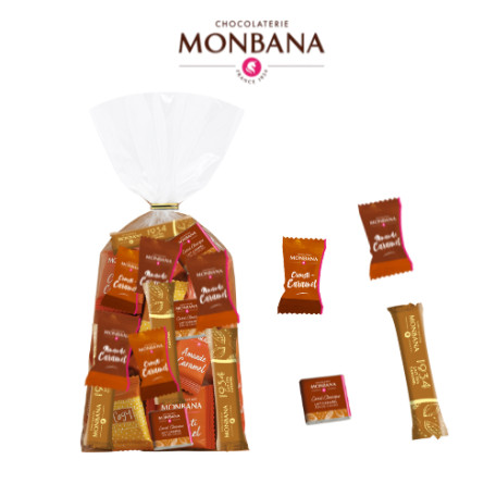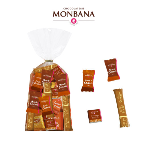 Ce délicieux sachet garni de 50 pièces - 4 variétés Monbana : carré lait caramel, stick 1934 caramel, crousti-caramel, amande caramel est parfait pour accompagner toutes vos pauses gourmandes.