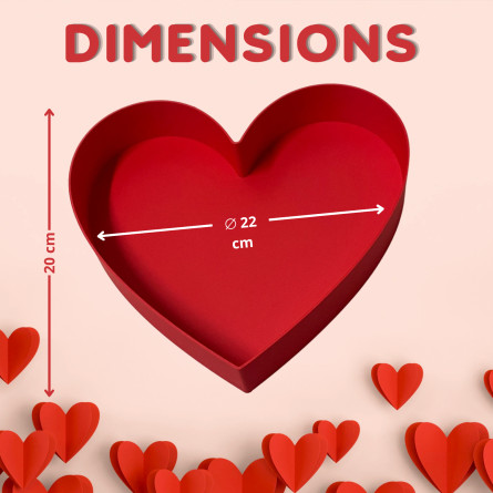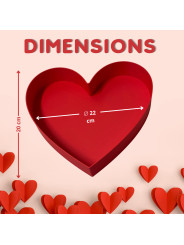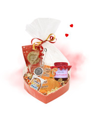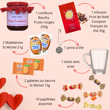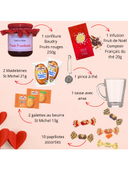 Coffret cadeau en forme de cœur, prêt à offrir, comprenant : 1 confiture fruits rouges (250 g), 2 madeleines, 2 galettes au beurre, 10 papillotes, 1 infusion fruit de Noël (20 g) avec pince à thé et 1 tasse, le tout emballé de papier cristal.