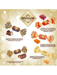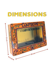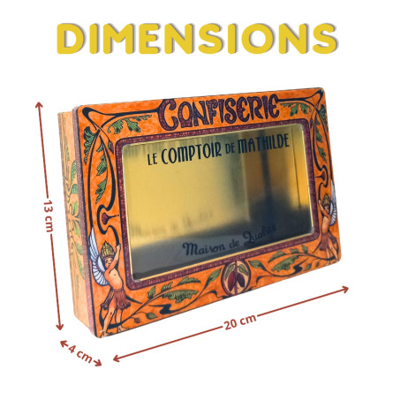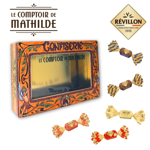 Boite "Le comptoir de Mathilde" garni de 30 papillotes assorties : pâtes de fruits abricot, fraise, poire et pralinés lait céréales croustillantes, chocolat double praliné noisette.