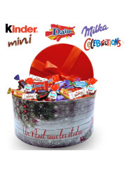 Cette boite ronde ornée d'un élégant ruban rouge en satin est garnie de 80 chocolats multi-variétés : Daim, Kinder, Milka, Mini Mars..