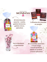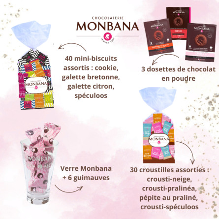 Pour une touche fondante et encore plus gourmande, la corbeille inclut également un verre Monbana de 30 cl garni de 6 guimauves moelleuses.