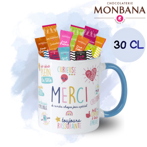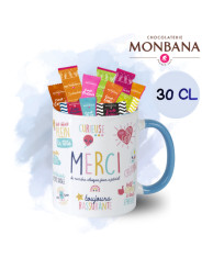 Offrez un moment de douceur avec ce mug message « MERCI » garni d’un généreux assortiment signé Monbana.