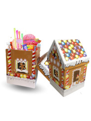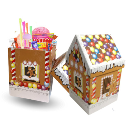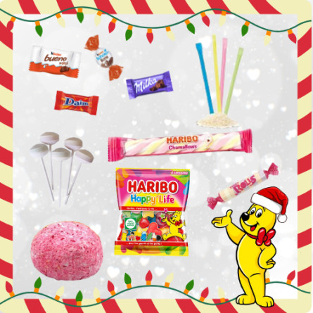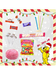 Boite en carton 17x10 cm garnie de 30 gourmandises pour ravir les petits gourmands : Kinder Schokobons et mini Bueno, Milka, Daim, , Boule coco, Sucette Lolies, Rolls dextrose, Paille acidulée, Haribo Girondo, Sachet Haribo 30gr.