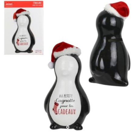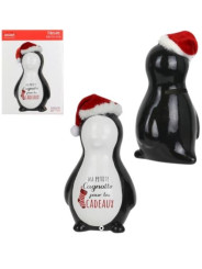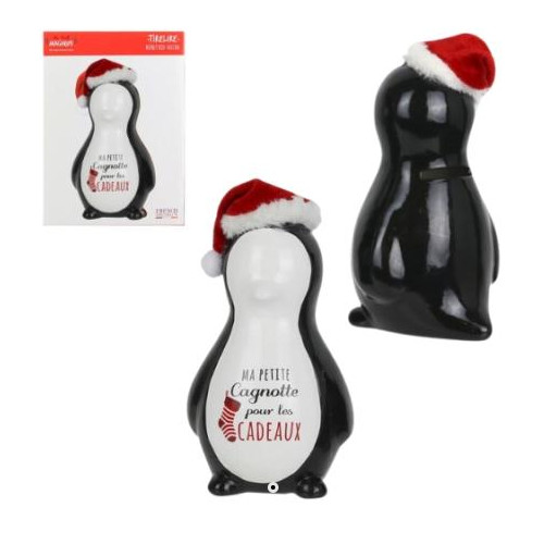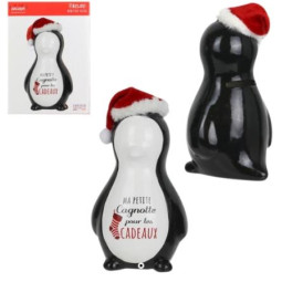 Tirelire pingouin en céramique. Message "Ma p'tite cagnotte pour les cadeaux"