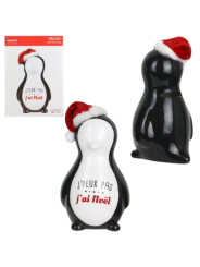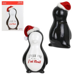 Tirelire pingouin en céramique. Message "J'peux pas j'ai Noël"