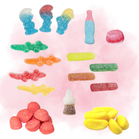 Un mélange coloré et fruité réunissant des incontournables comme les Schtroumpfs, bouteilles Coca, bananes et autres gourmandises des marques Haribo, Lutti et Fini.