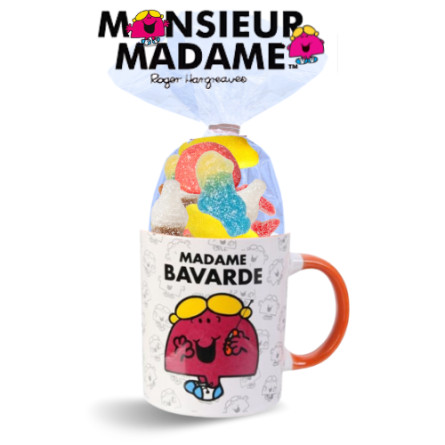 Faites plaisir avec ce mug Madame Bavarde garni de 25 bonbons acidulés gélifiés.