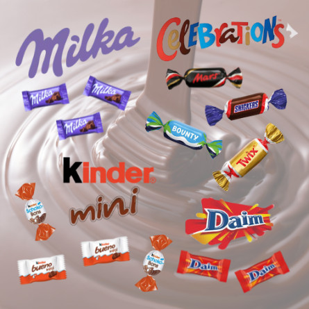 Miniatures mix : sucre, sirop de glucose, beurre de cacao, lait écrémé en poudre, pâte de cacao, cacahuètes, matière grasse végétale, beurre concentré, lactose, farine de blé, noix de coco séchée, petit lait en poudre, huile de tournesol, lait entier en poudre, émulsifiants (lécithine de SOJA, E471), extrait de malt d'orge, cacao maigre, sel, humectant (glycérol), blanc d'œuf en poudre, extrait naturel de vanille, protéine de lait hydrolysée, poudres à lever (E341, E500, E501)
