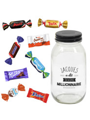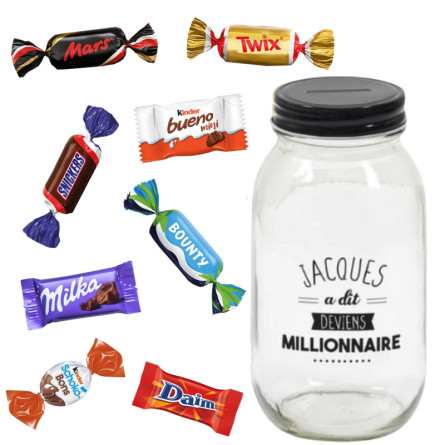Cette tirelire en verre en forme de bocal et à message est garni de 30 mini chocolats assortis : Milka nature, Kinder Schokobons, Kinder mini bueno, Daim, Miniatures mix. Une idée cadeau gourmande et originale