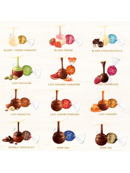 Blanc Stracciatella : chocolat blanc parsemé de petits éclats de cacao croquants.