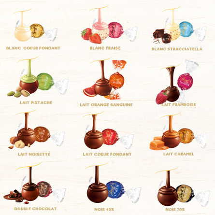 Chaque chocolat de 12,5 g renferme un cœur fondant unique, enveloppé d’une fine coque croquante, la signature emblématique de Lindt.