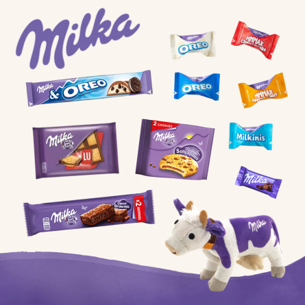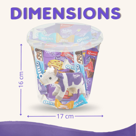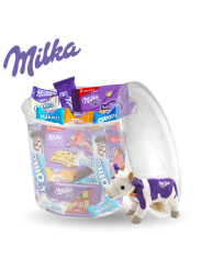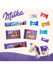 Fondez de plaisir grâce à cette box goûter MILKA garnie d'un assortiment de 8 biscuits emballés individuellement : Brownie, Lu Pocket, Cookies Sensation, Barre Oréo, 42 Milka Favourites et 1 peluche vache 10 cm.
