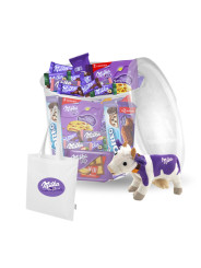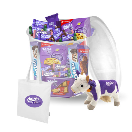 Bonus exclusifs : 1 peluche vache Milka, douce et câline, idéale pour petits et grands, 1 tote bag Milka, pratique et stylé pour transporter vos gourmandises ou vos affaires