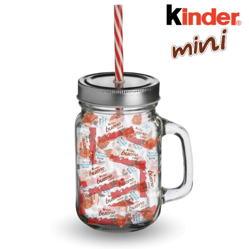 La chope est garnie de 15 chocolats Kinder : Mini Bueno fondants et Schokobons croustillants, pour un plaisir gourmand à partager ou offrir.