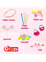 Ce mug est accompagné de 20 délicieux bonbons au dextrose : boules, colliers, rolls, sucettes et soucoupes, pour un moment sucré et convivial.