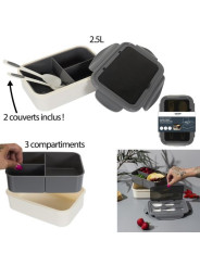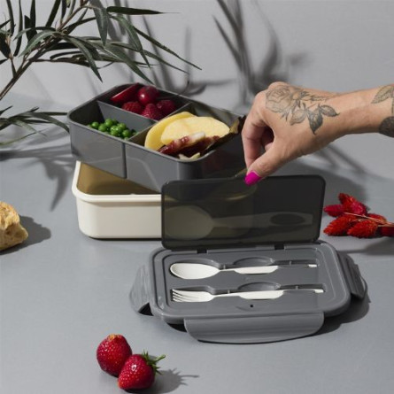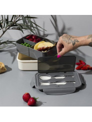 Cette lunch box se distingue par son design et son côté pratique, idéal pour les repas nomades. Grâce à ses compartiments intérieurs, les aliments restent bien séparés, et les couverts astucieusement intégrés au couvercle sont facilement accessibles.