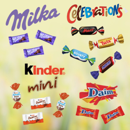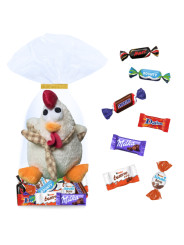 Petite peluche poule dans son sachet prêt à offrir accompagnée de 20 chocolats assortis : Kinder Schokobons, Mini Bueno, Daim, Milka, Miniatures Mix.