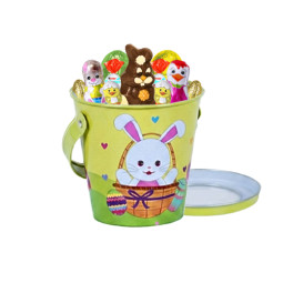 Petit moulage poussin 5g : sucre, BEURRE de cacao, poudre de LAIT entier, pâte de cacao, émulsifiant, lécithine de SOJA, arômes.