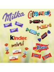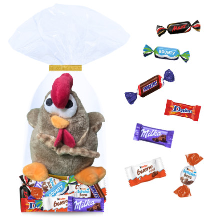 Petite peluche poule dans son sachet prêt à offrir accompagnée de 20 chocolats assortis : Kinder Schokobons, Mini Bueno, Daim, Milka, Miniatures Mix.