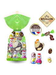 Sachet garni de 20 chocolats de Pâques : papillotes lapin et petits oeufs praliné REVILLON, moulage en chocolat au lait ROHAN