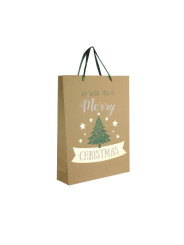 Sac en papier 28x21 cm avec anses en tissu, détails du décor métallisés.