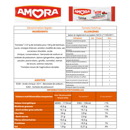 Ingrédients : tomates (137g de tomates pour 100g de ketchup), sucre, vinaigre d’alcool, amidon modifié de maïs, sel, correcteur d’acidité : acide citrique, conservateurs : benzoate de sodium, sorbate de potassium, épices (gingembre, oignon en poudre, poivre blanc, clou de girofle, cannelle), extrait de levure, arômes naturels.