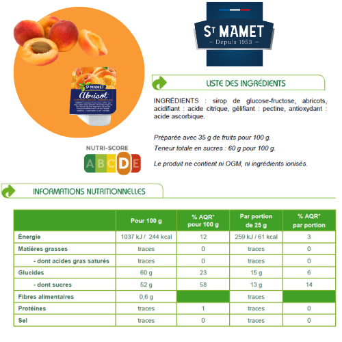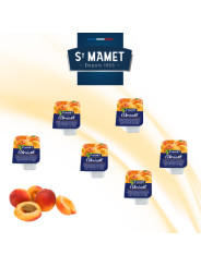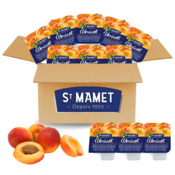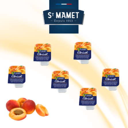 Les barquettes de confiture d'abricot Saint Mamet sont des portions individuelles d’environ 25 g, idéales pour un usage familial au petit-déjeuner ou au goûter.