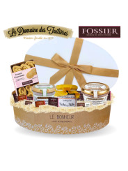 Ce joli coffret en forme orné de son ruban satin, est parfait pour enchanter les papilles des plus gourmands ! Prêt à offrir, il est garni de 2 terrines 180g, 1 barquette salés persillade 75g, 1 confiture Pêche Melba 20g et 16 chocolats et nougats.
